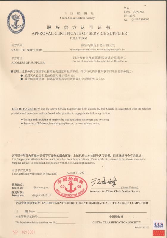 秦皇島順達(dá)船務(wù)有限公司位于美麗的海濱城市、中國北方著名的能源輸出大港--秦皇島。公司從事于船舶修理、物料供應(yīng)、水下檢測、船體測厚、消防救生設(shè)備及救生艇檢驗、電氣自動化修理等服務(wù)。 公司自1997年成立至今,先后為國內(nèi)外船東修理、檢驗各類船舶萬余艘,積累了豐富的施工經(jīng)驗。公司現(xiàn)有場地100余畝,員工30余人,以及工程用車若干臺。我們公司一直本著嚴(yán)以律己、真誠待人、精益求精、信譽(yù)至上的經(jīng)營理念,以優(yōu)質(zhì)的服務(wù)、專業(yè)的施工、合理的收費(fèi),得到了國內(nèi)外船東的廣泛認(rèn)可,贏得了良好的口碑和信譽(yù)。 公司已取得了中國船級社(CCS)、美國船級社(ABS)、日本船級社(NK)、德國船級社(DNV GL)等各個船級社的消防救生和救生艇檢驗資質(zhì), ...